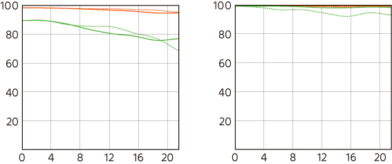 这两张图的横坐标是传感器上的点到中心的距离,纵坐标则是清晰度。实线和虚线分别表示两个方向上的清晰度。左边的图是光圈全开时的 MTF 曲线,右边的则是在 F8 光圈下的曲线。